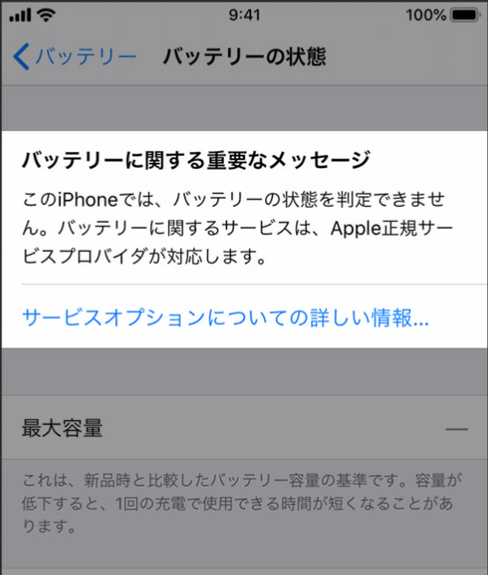 例えば中古iPhoneを購入して、純正以外のバッテリーに交換した場合、バッテリー最大容量表示がされなくなります。