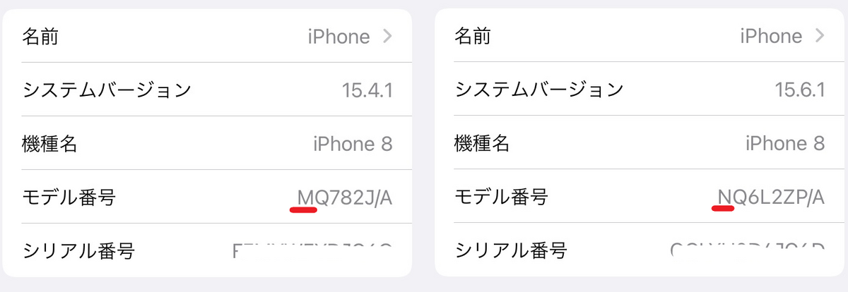 iPhoneの設定画面 → 「一般 」→ 「情報」を開く 左:新品、右:交換品